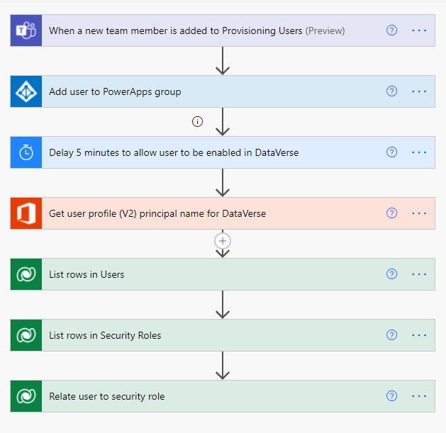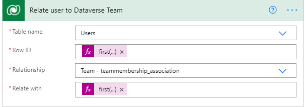Now the user has the required security role(s), the user can easily be added to teams in DataVerse, using the same logic of listing rows in Teams matching the required team(s), and then relating the user to that team. Quite likely here a loop may be required if multiple teams are required.