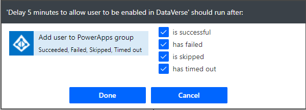 Adding a user to an Azure security group will fail if the user already exists there, and this will happen (users seem to return frequently in the real world). To get around this, error handling is required. A simple way is to allow the Flow to continue on failure of the Azure AD group, by configuring Run After in the next step: