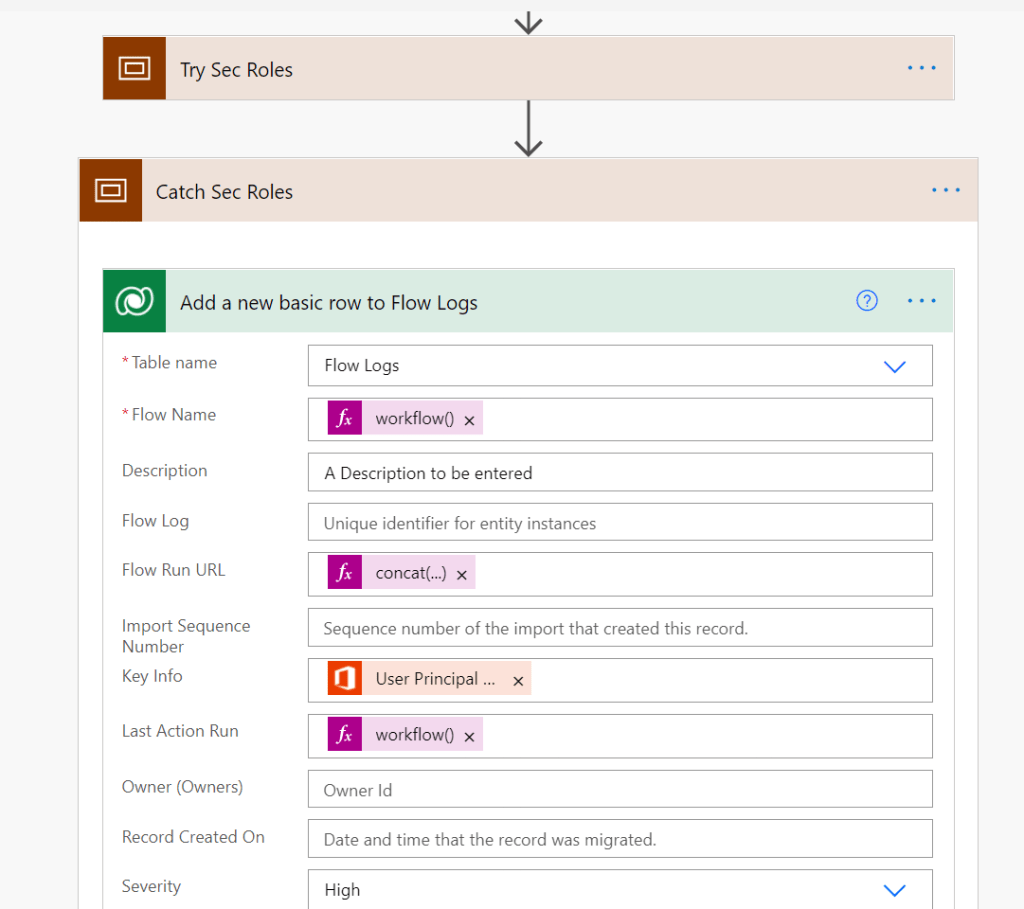 After I received a few fails on this Flow, I added on error handling to my Flow Logging entity. All the security roles and team DataVerse actions are now placed in the Try Sec Roles scope, and the Catch Sec Roles captures any error in those steps. The most common error is that the user does not yet exist in DataVerse, as the sync is slow between Azure and DataVerse. This is then caught, and the error including the user’s principal name is written to the Flow Log, where another Flow fires to raise a ticket with IT Support.