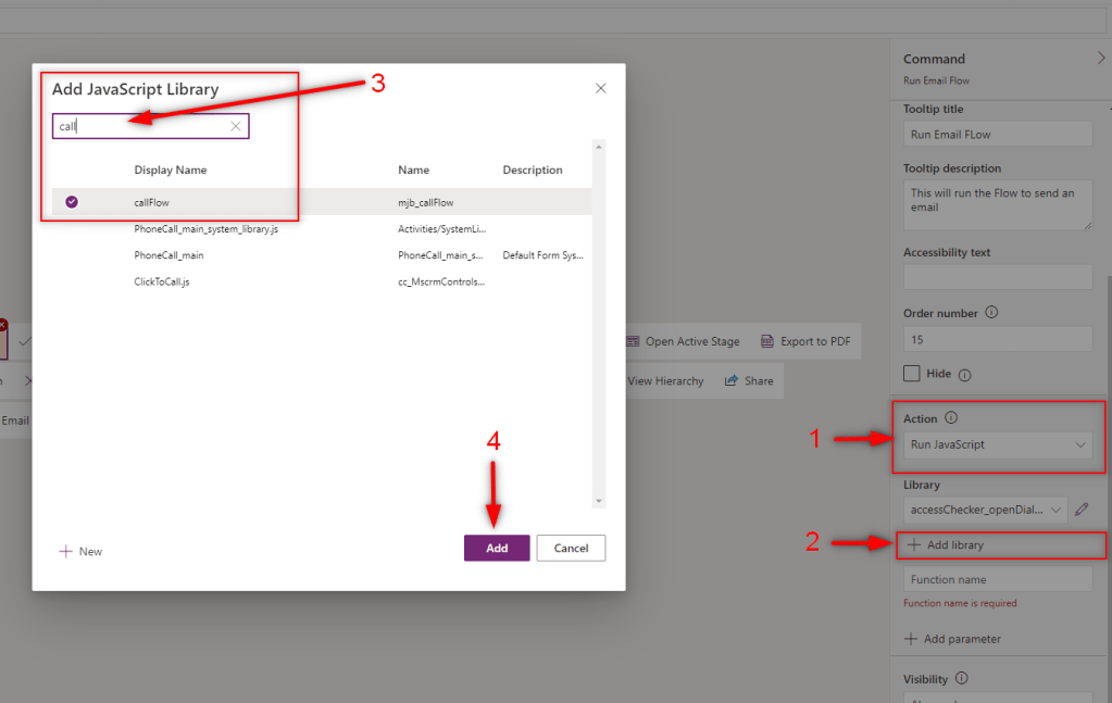 This will require a new web resource of type JavaScript. The function name callFlow is input into the Command bar editor later, and this will be called with the 2 parameters defined there.