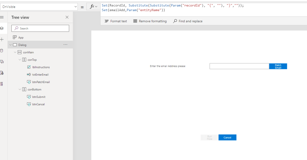 to show the fields to patch the record and disable the Run Flow button. The button to patch the email patches the record and sets the variable emailAdd to display the Run Flow button: