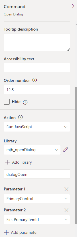 The dialog will be opened via JavaScript. Go back to the command bar editor (preview) in the MDA, and find the form with the earlier buttons. Add a new button as before, with the Action Run JavaScript and a new JavaScript library (Click + Add Library and then + New on the next dialog) . Pass in the Parameter PrimaryControl which is the form context, and the FirstPrimaryItemID which is the record GUID.