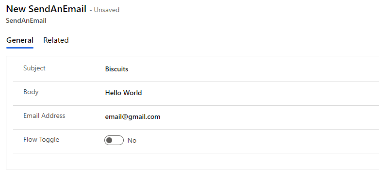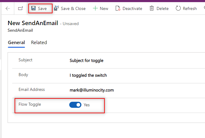 - A toggle switch on the form to fire the Flow via a DataVerse modified trigger.