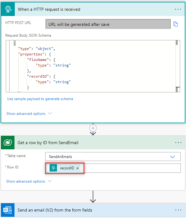 The trigger to the Flow will now change to the HTTP connector.( When a HTTP request is received). The JSON schema needs to be input. An example is under this image; the Get a Row ID in the following action needs to be pointed at the trigger output.