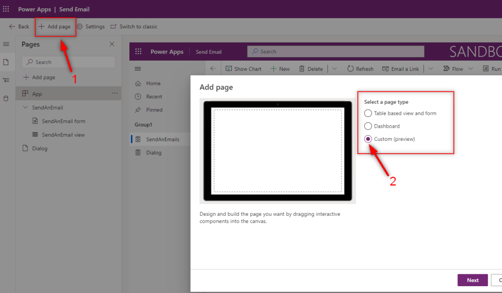 A new command button will be added to the MDA, calling a new JavaScript file, and a new Page created. Edit the MDA again in preview mode, and click + Add Page, selecting Custom (preview), and on the second dialog choose Create a new custom page and name it Dialog. This will open up the canvas app design screen.