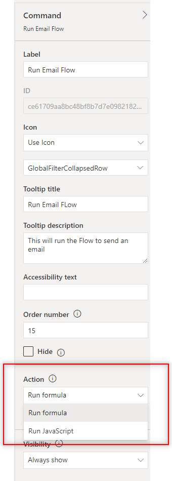 and on the right hand pane, edit the command, first with a good name, and a fun icon. The Action towards the bottom is the key part. There are two choices, Run formula or Run JavaScript. Currently, the formula does not let you directly run a Flow like from a canvas app, for example: