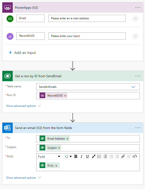 I created a new Flow called Flow from Custom Page, as before but with a PowerApps trigger this time, passing in two parameters, the email address and the record GUID.