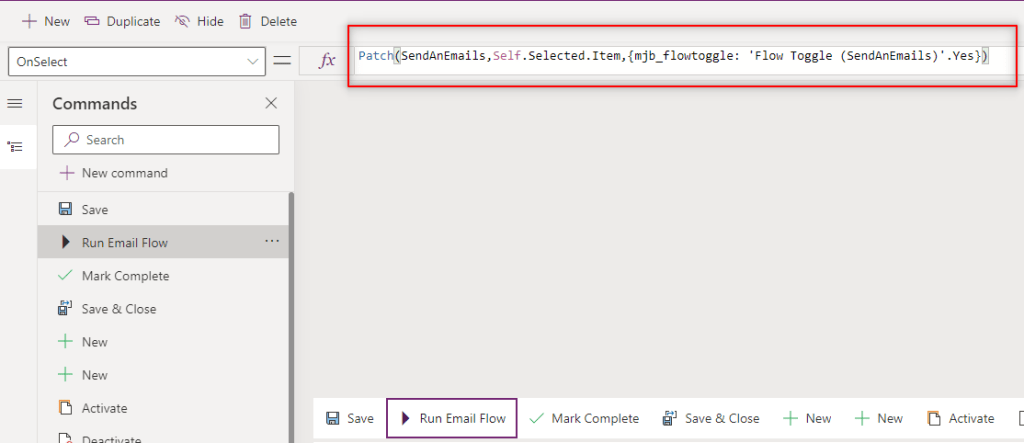 Patch(SendAnEmails,Self.Selected.Item,{mjb_flowtoggle: 'Flow Toggle (SendAnEmails)'.Yes})