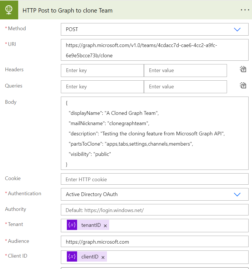 In Flow, I create a simple HTTP request to Graph. The parts of the Team to be cloned can be specified in the JSON body.