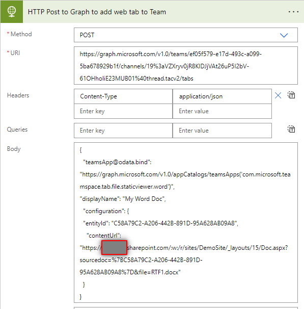 Example of adding a Word document to a tab. The body of the previous request is altered to the below (replace MYSPDOMAIN with the relevant domain). Opening the file in SharePoint, the URL is required, and within that, the sourcedoc field ( the source docID is in the URL thus: sourcedoc=%7B{sourceDocId}%7D).