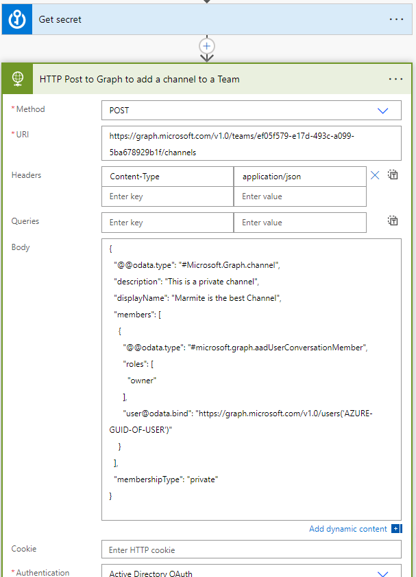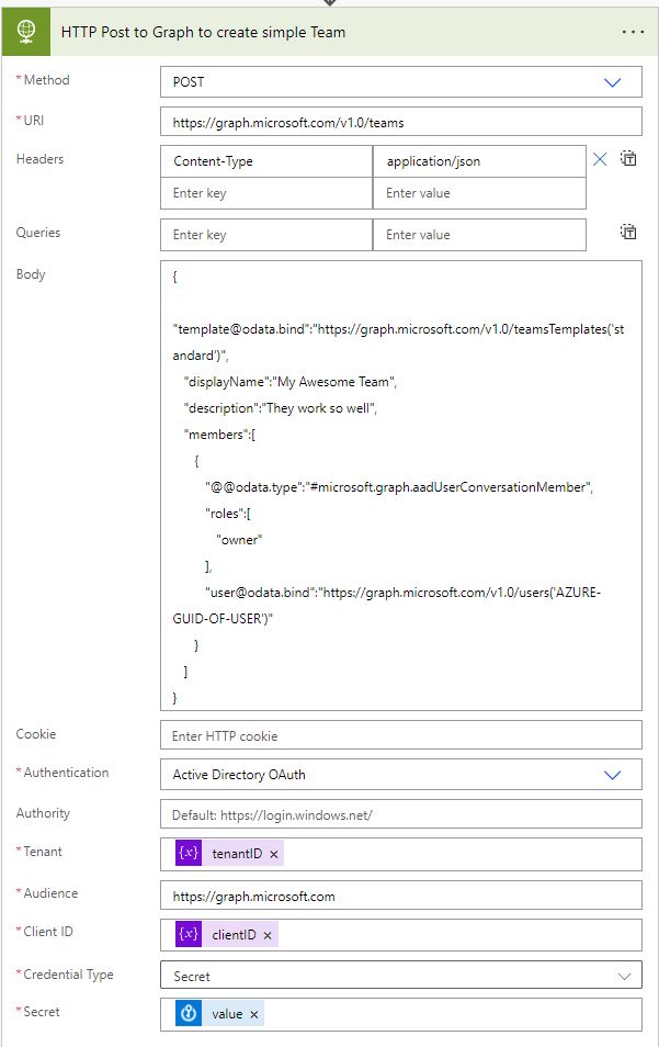 First, a substitute for the option 1 above, create a simple Team. The JSON below sets the display name and description, and adds an owner which is mandatory. Replace the AZURE-GUID-OF-USER string with a real user in Azure !
