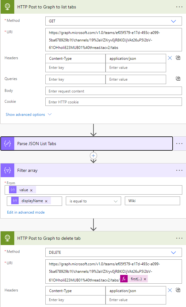 First, use the same HTTP Graph call from before, but this time switching POST to GET. Throw the results into a Parse JSON for legability, then filter the array on the name of the tab, and finally DELETE the tab passing in the ID: