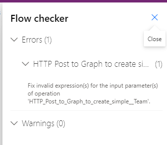 Using the HTTP Connector makes the Flow checker throw an odd error “Fix Invalid expression(s) for the input parameter(s) of operation”, which prevents the Flow from being saved. This took a long while to solve, with people suggesting to use the HTTP Azure connector where this error does not appear, particularly as it does not use the application registration but the user owning the Flow connection, which makes the Graph permissioning more awkward.
