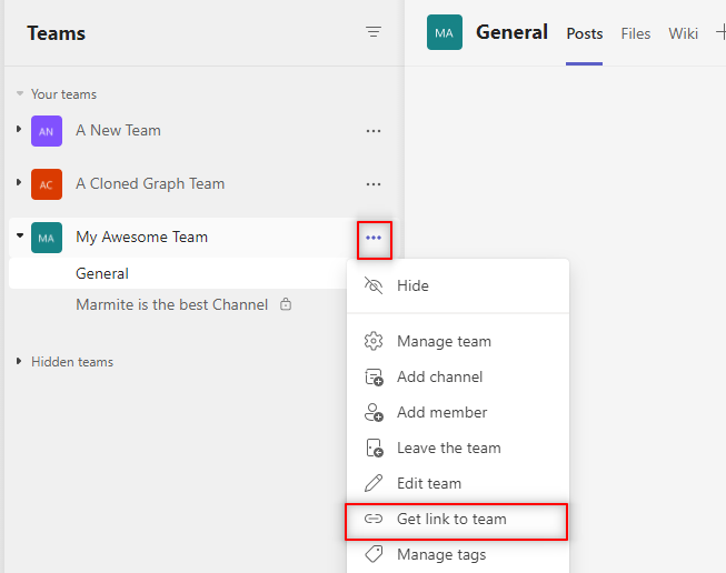 To get the IDs required from an existing Team, go into Teams, select the Team, and click on the ellipsis and choose Get Link to team, and copy the URL.