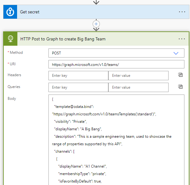 This seems to be Microsoft’ s preferred method. The members of the group become members of the Team. Creating an Office Group cannot be handled in Flow yet, so again an HTTP call from Flow is required, which kind of defeats the point to me. Also the documentation states waiting up to 15 minutes after group creation before creating the Team is wise. This also requires Graph to create a Team this way.