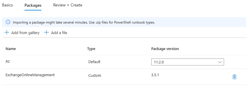 Go to Packages, and add (from gallery) here Exchange Online Management, selecting all the cmdlets unless you know what you are exactly doing ! It should look like this. Review and Create.