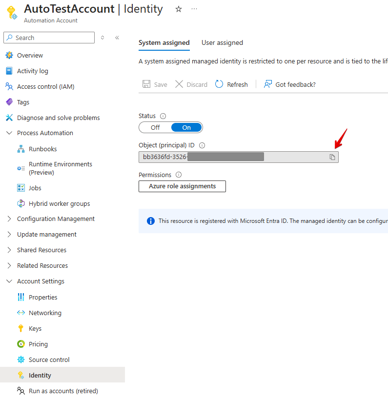 Pre requisite: Get the Identity Object ID from the Automation Account:
